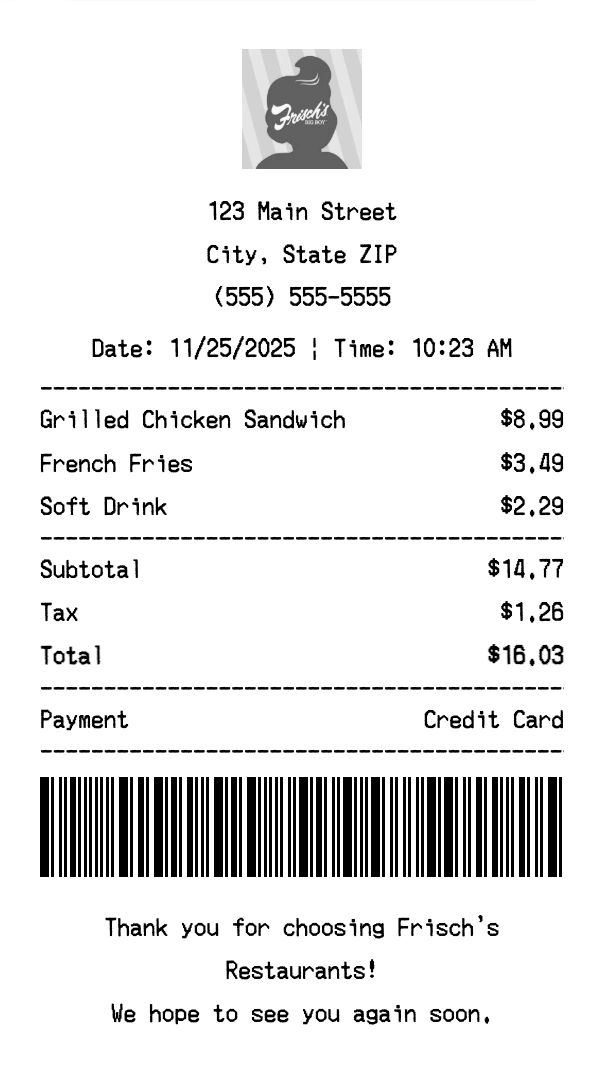 Create authentic Frisch's Restaurants receipts instantly. Our free receipt generator produces professional casual dining receipts with company logo, itemized purchases, tax calculations, and payment details. Perfect for expense tracking, reimbursement, and documentation. Download high-quality PNG receipts in seconds.