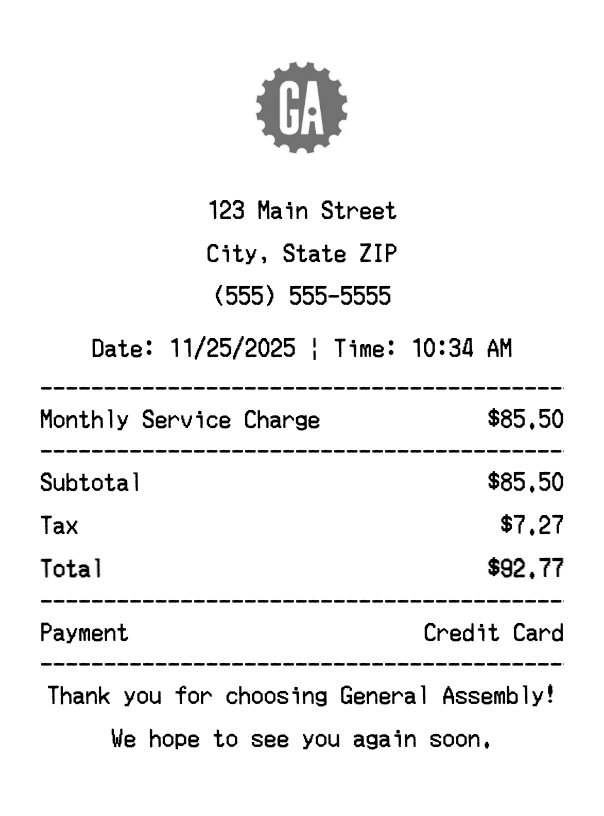 Create authentic General Assembly receipts instantly. Our free receipt generator produces professional education receipts with company logo, itemized purchases, tax calculations, and payment details. Perfect for expense tracking, reimbursement, and documentation. Download high-quality PNG receipts in seconds.