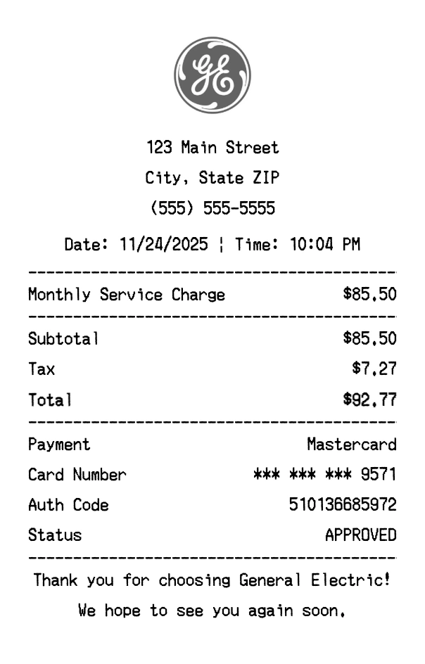 Create authentic General Electric receipts instantly. Our free receipt generator produces professional industrial receipts with company logo, itemized purchases, tax calculations, and payment details. Perfect for expense tracking, reimbursement, and documentation. Download high-quality PNG receipts in seconds.