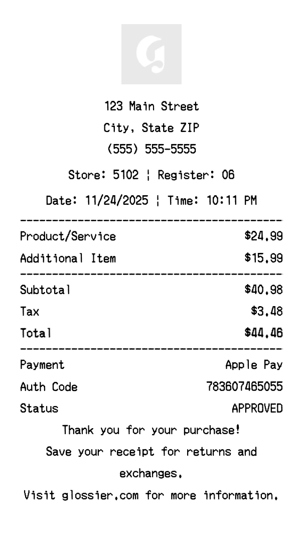 Create authentic Glossier receipts instantly. Our free receipt generator produces professional beauty receipts with company logo, itemized purchases, tax calculations, and payment details. Perfect for expense tracking, reimbursement, and documentation. Download high-quality PNG receipts in seconds.