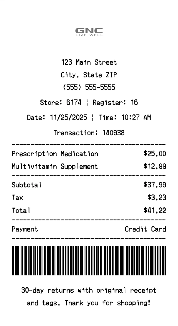 Create authentic GNC receipts for health & wellness purchases. Our free receipt generator tool helps you create professional, detailed receipts instantly. Perfect for business expense tracking, reimbursement requests, and personal documentation. Download high-quality PNG receipts in seconds, no signup required.