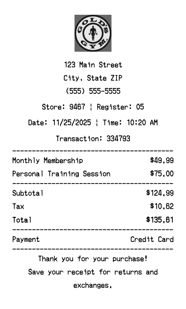 Create authentic Gold's Gym receipts for fitness purchases. Our free receipt generator tool helps you create professional, detailed receipts instantly. Perfect for business expense tracking, reimbursement requests, and personal documentation. Download high-quality PNG receipts in seconds, no signup required.