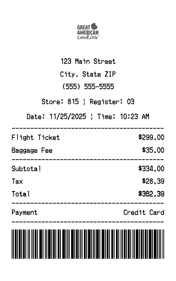 Create authentic Great American Cookies receipts for bakery purchases. Our free receipt generator tool helps you create professional, detailed receipts instantly. Perfect for business expense tracking, reimbursement requests, and personal documentation. Download high-quality PNG receipts in seconds, no signup required.