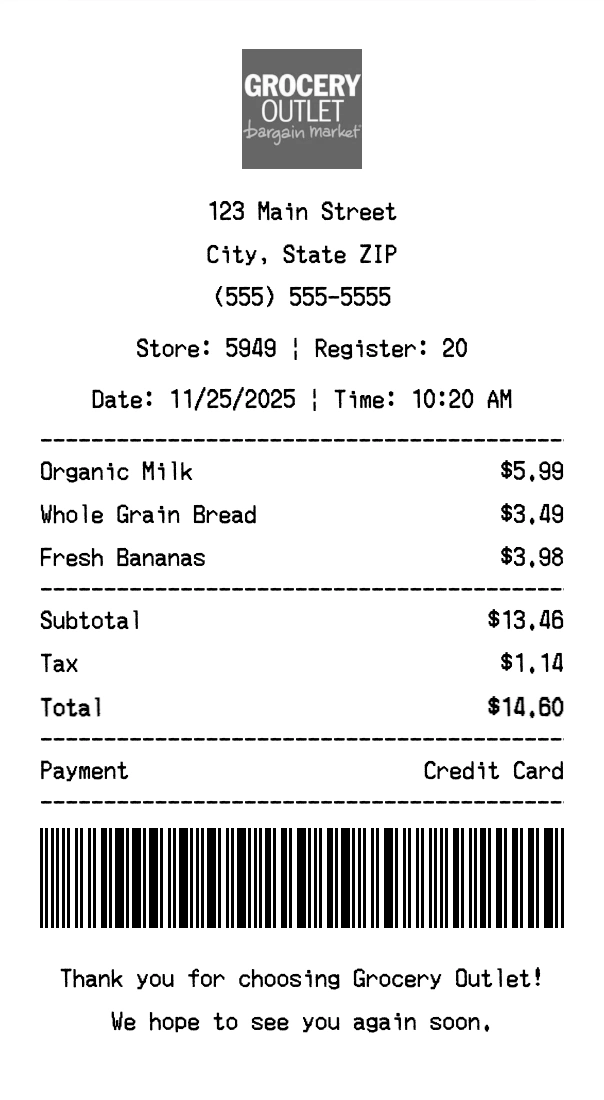 Create authentic Grocery Outlet receipts for grocery store purchases. Our free receipt generator tool helps you create professional, detailed receipts instantly. Perfect for business expense tracking, reimbursement requests, and personal documentation. Download high-quality PNG receipts in seconds, no signup required.
