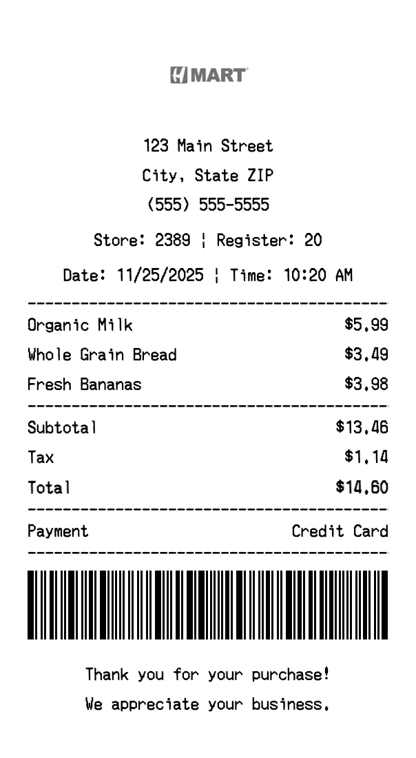Create authentic H-Mart receipts for grocery store purchases. Our free receipt generator tool helps you create professional, detailed receipts instantly. Perfect for business expense tracking, reimbursement requests, and personal documentation. Download high-quality PNG receipts in seconds, no signup required.