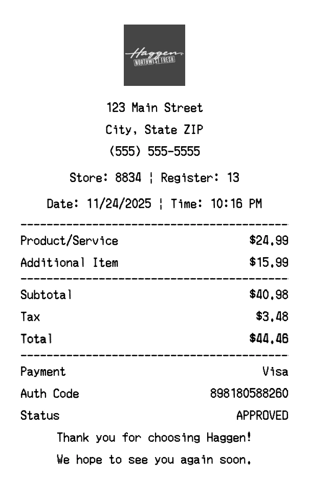 Our Haggen receipt generator creates professional receipts that match the authentic Haggen format. Each receipt includes the company logo, business information, transaction details, itemized purchase list, tax calculations, and payment information. All receipts are formatted to look exactly like real Haggen receipts, making them perfect for expense reports, tax documentation, and reimbursement purposes.