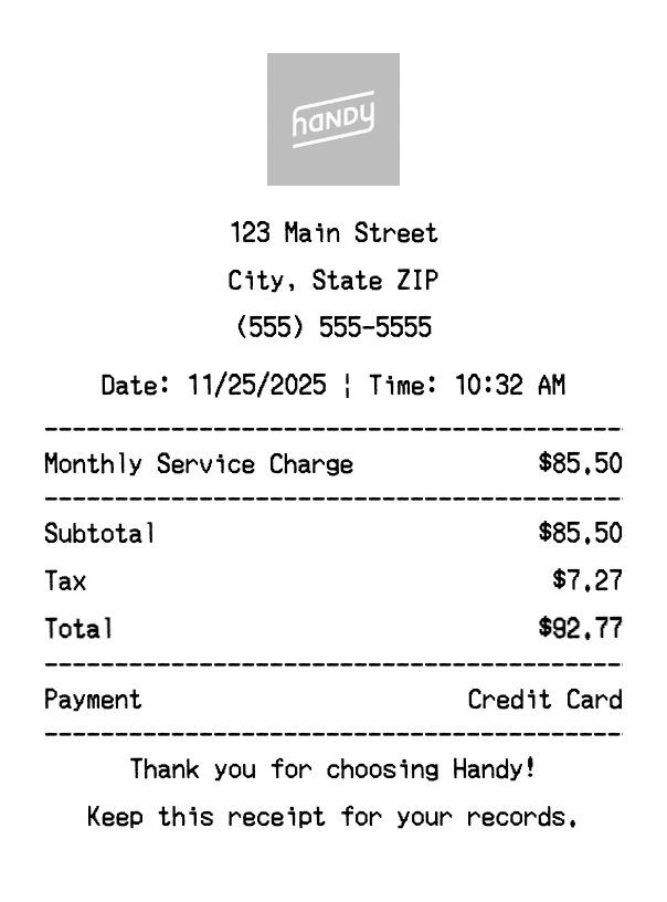 Create authentic Handy receipts instantly. Our free receipt generator produces professional home services receipts with company logo, itemized purchases, tax calculations, and payment details. Perfect for expense tracking, reimbursement, and documentation. Download high-quality PNG receipts in seconds.