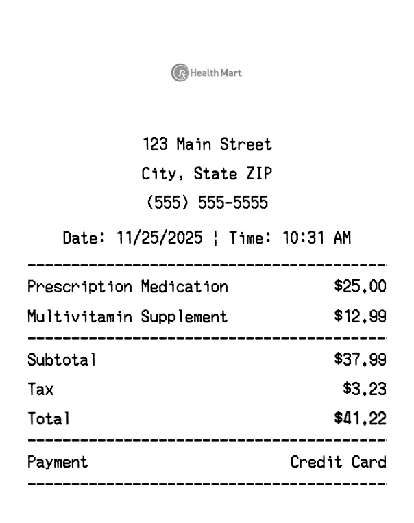 Create authentic Health Mart Pharmacy receipts instantly. Our free receipt generator produces professional pharmacy receipts with company logo, itemized purchases, tax calculations, and payment details. Perfect for expense tracking, reimbursement, and documentation. Download high-quality PNG receipts in seconds.