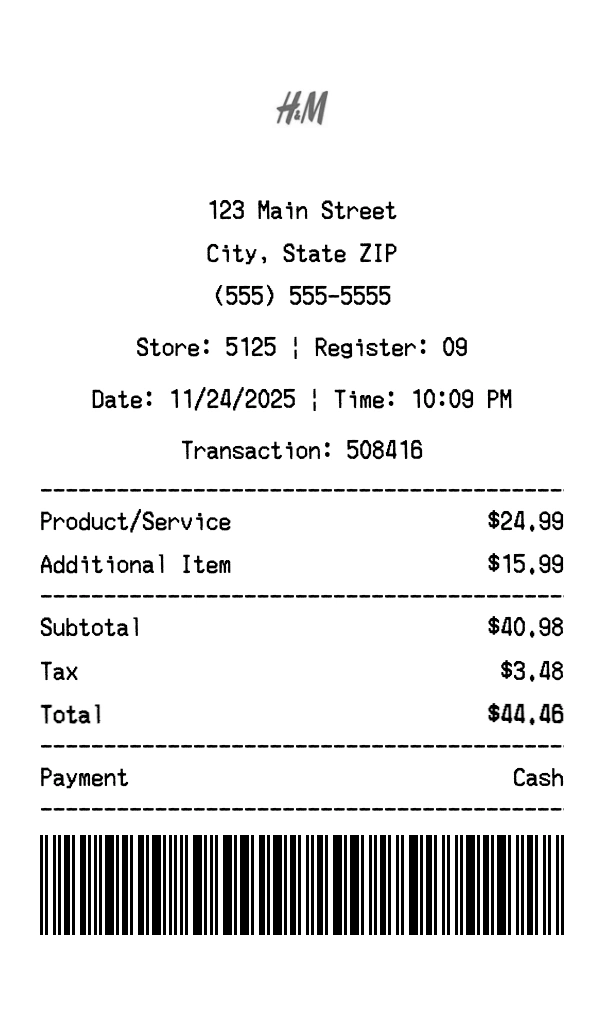 Create authentic H&M receipts for fashion purchases. Our free receipt generator tool helps you create professional, detailed receipts instantly. Perfect for business expense tracking, reimbursement requests, and personal documentation. Download high-quality PNG receipts in seconds, no signup required.