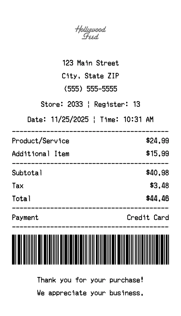 Our Hollywood Feed receipt generator creates professional receipts that match the authentic Hollywood Feed format. Each receipt includes the company logo, business information, transaction details, itemized purchase list, tax calculations, and payment information. All receipts are formatted to look exactly like real Hollywood Feed receipts, making them perfect for expense reports, tax documentation, and reimbursement purposes.