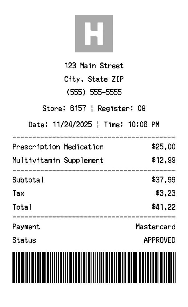 Our Humana receipt generator creates professional receipts that match the authentic Humana format. Each receipt includes the company logo, business information, transaction details, itemized purchase list, tax calculations, and payment information. All receipts are formatted to look exactly like real Humana receipts, making them perfect for expense reports, tax documentation, and reimbursement purposes.