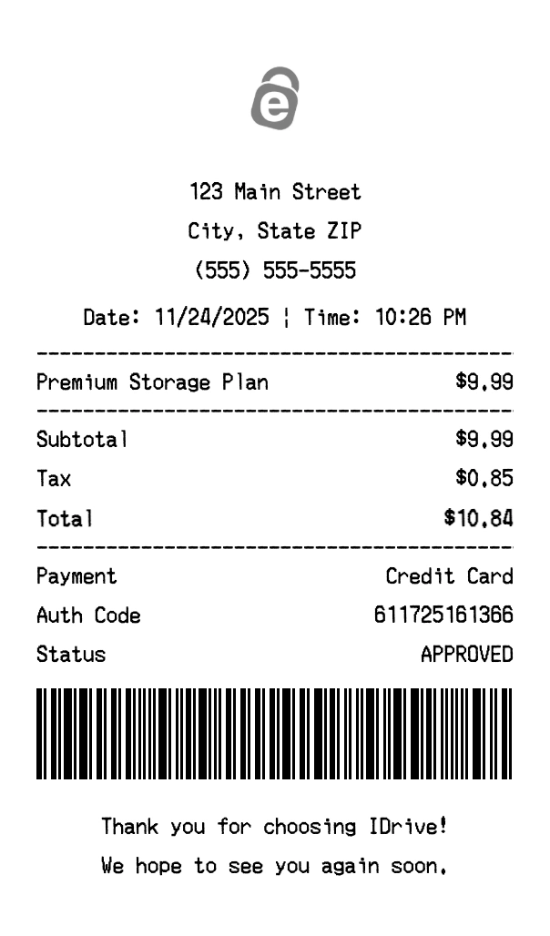 Create authentic IDrive receipts for cloud storage purchases. Our free receipt generator tool helps you create professional, detailed receipts instantly. Perfect for business expense tracking, reimbursement requests, and personal documentation. Download high-quality PNG receipts in seconds, no signup required.