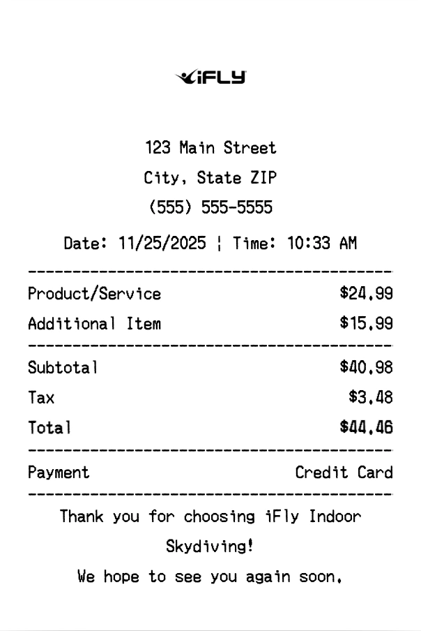Create authentic iFly Indoor Skydiving receipts instantly. Our free receipt generator produces professional entertainment receipts with company logo, itemized purchases, tax calculations, and payment details. Perfect for expense tracking, reimbursement, and documentation. Download high-quality PNG receipts in seconds.