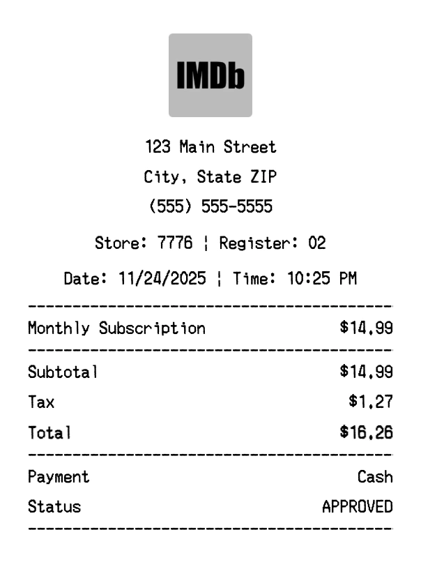 Create authentic IMDb TV receipts instantly. Our free receipt generator produces professional streaming receipts with company logo, itemized purchases, tax calculations, and payment details. Perfect for expense tracking, reimbursement, and documentation. Download high-quality PNG receipts in seconds.