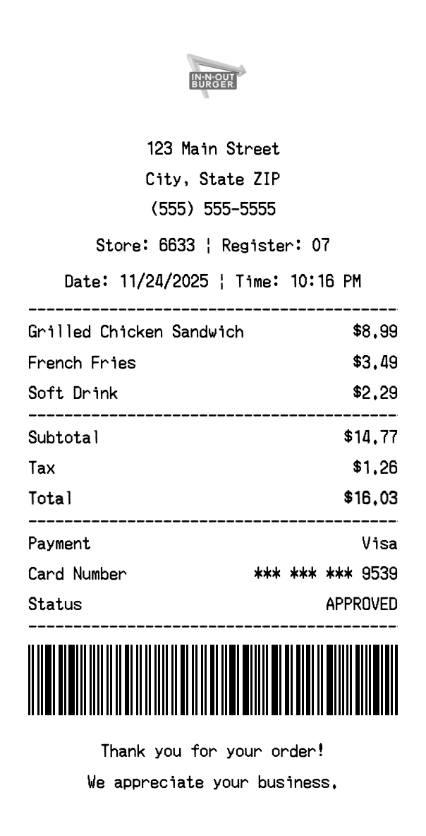 Create authentic In-N-Out Burger receipts for fast food purchases. Our free receipt generator tool helps you create professional, detailed receipts instantly. Perfect for business expense tracking, reimbursement requests, and personal documentation. Download high-quality PNG receipts in seconds, no signup required.