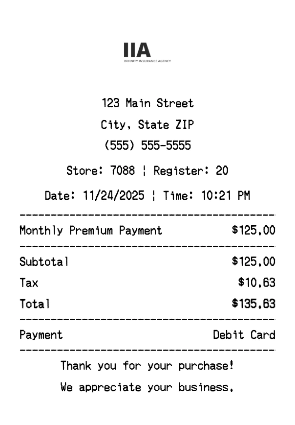 Create authentic Infinity Insurance receipts instantly. Our free receipt generator produces professional insurance receipts with company logo, itemized purchases, tax calculations, and payment details. Perfect for expense tracking, reimbursement, and documentation. Download high-quality PNG receipts in seconds.