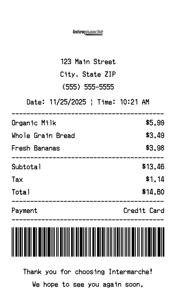 Create authentic Intermarché receipts for grocery store purchases. Our free receipt generator tool helps you create professional, detailed receipts instantly. Perfect for business expense tracking, reimbursement requests, and personal documentation. Download high-quality PNG receipts in seconds, no signup required.