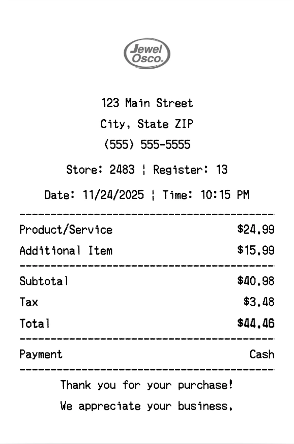 Create authentic Jewel-Osco receipts for grocery store purchases. Our free receipt generator tool helps you create professional, detailed receipts instantly. Perfect for business expense tracking, reimbursement requests, and personal documentation. Download high-quality PNG receipts in seconds, no signup required.