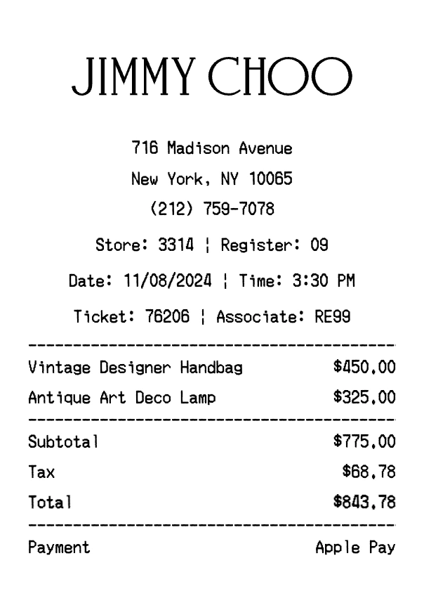 Create authentic Jimmy Choo receipts for fashion & luxury purchases. Our free receipt generator tool helps you create professional, detailed receipts instantly. Perfect for business expense tracking, reimbursement requests, and personal documentation. Download high-quality PNG receipts in seconds, no signup required.