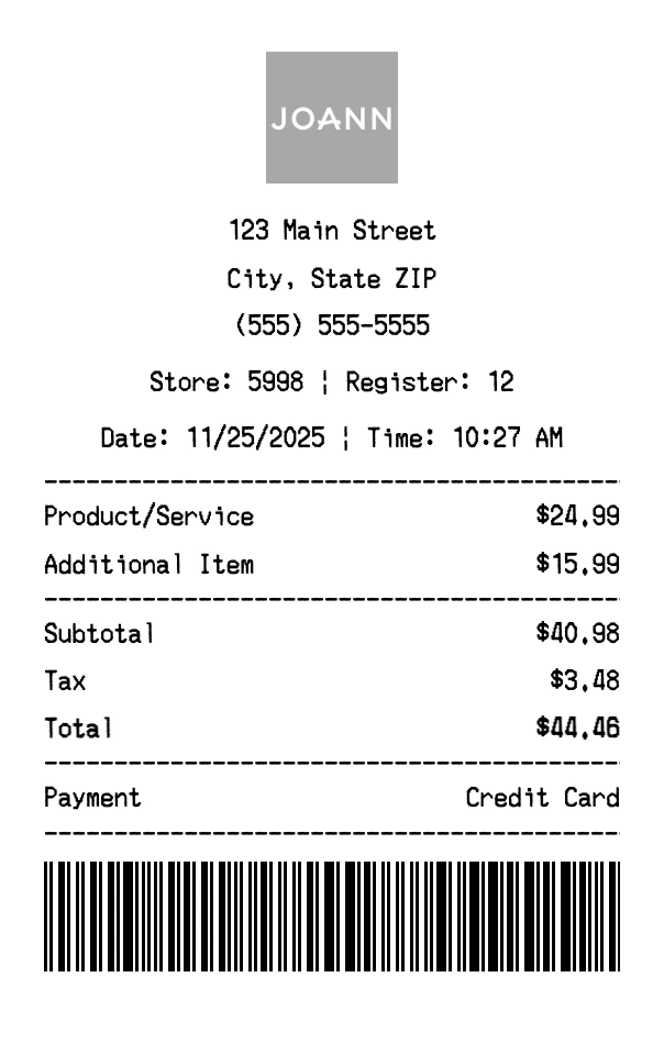 Create authentic JoAnn receipts for crafts purchases. Our free receipt generator tool helps you create professional, detailed receipts instantly. Perfect for business expense tracking, reimbursement requests, and personal documentation. Download high-quality PNG receipts in seconds, no signup required.
