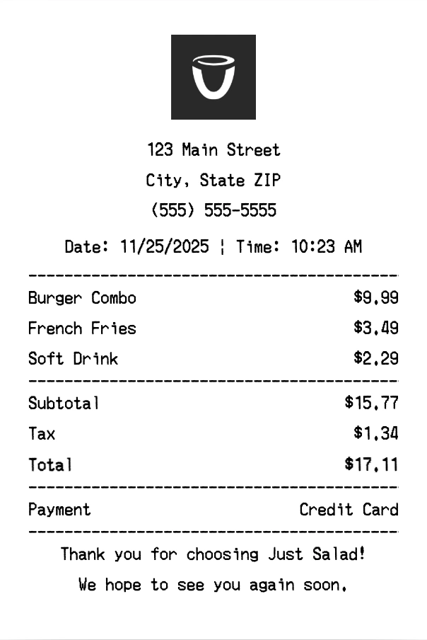 Create authentic Just Salad receipts instantly. Our free receipt generator produces professional fast casual receipts with company logo, itemized purchases, tax calculations, and payment details. Perfect for expense tracking, reimbursement, and documentation. Download high-quality PNG receipts in seconds.