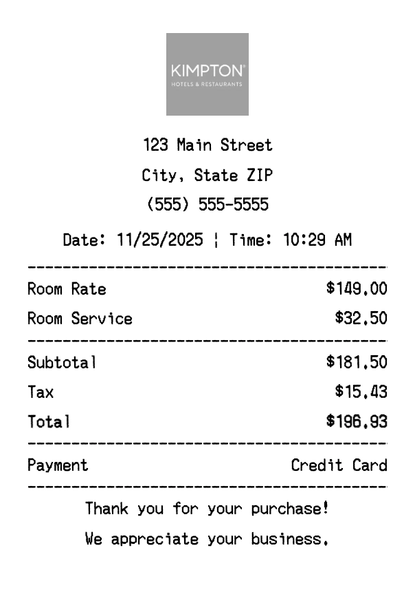 Create authentic Kimpton Hotels & Restaurants receipts for hotels purchases. Our free receipt generator tool helps you create professional, detailed receipts instantly. Perfect for business expense tracking, reimbursement requests, and personal documentation. Download high-quality PNG receipts in seconds, no signup required.