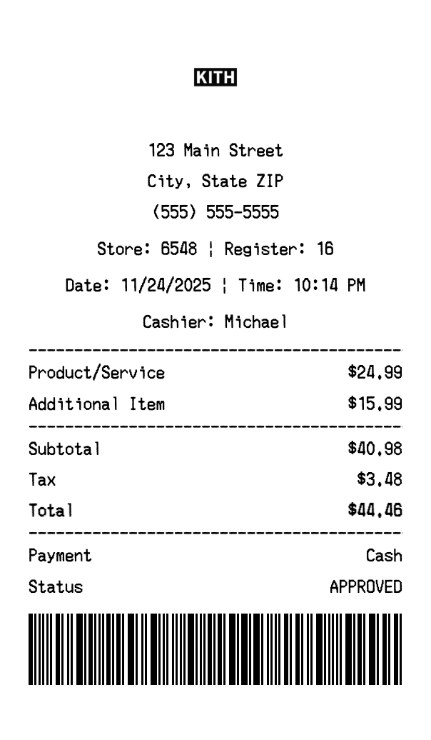 Create authentic Kith receipts for streetwear purchases. Our free receipt generator tool helps you create professional, detailed receipts instantly. Perfect for business expense tracking, reimbursement requests, and personal documentation. Download high-quality PNG receipts in seconds, no signup required.