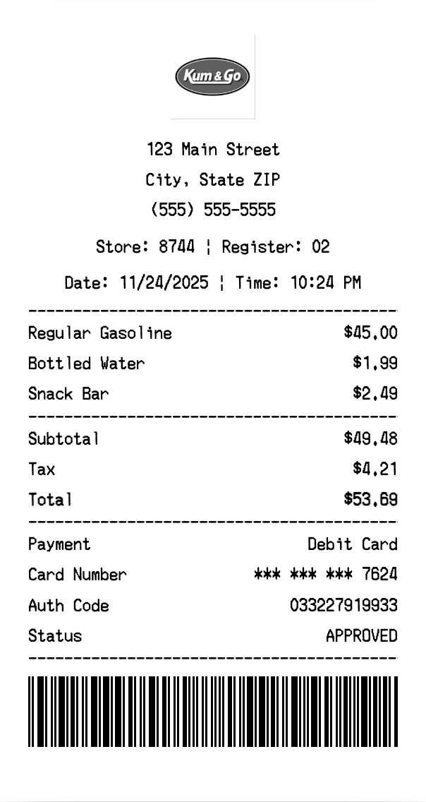 Create authentic Kum & Go receipts for convenience store purchases. Our free receipt generator tool helps you create professional, detailed receipts instantly. Perfect for business expense tracking, reimbursement requests, and personal documentation. Download high-quality PNG receipts in seconds, no signup required.