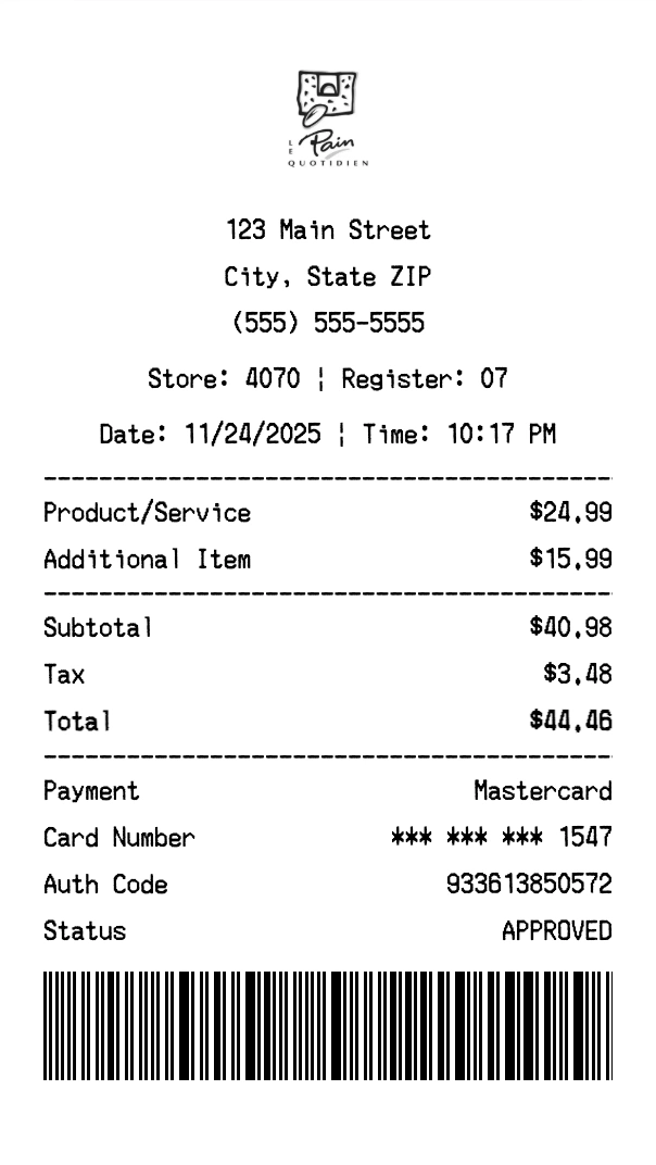 Create authentic Le Pain Quotidien receipts instantly. Our free receipt generator produces professional cafe receipts with company logo, itemized purchases, tax calculations, and payment details. Perfect for expense tracking, reimbursement, and documentation. Download high-quality PNG receipts in seconds.
