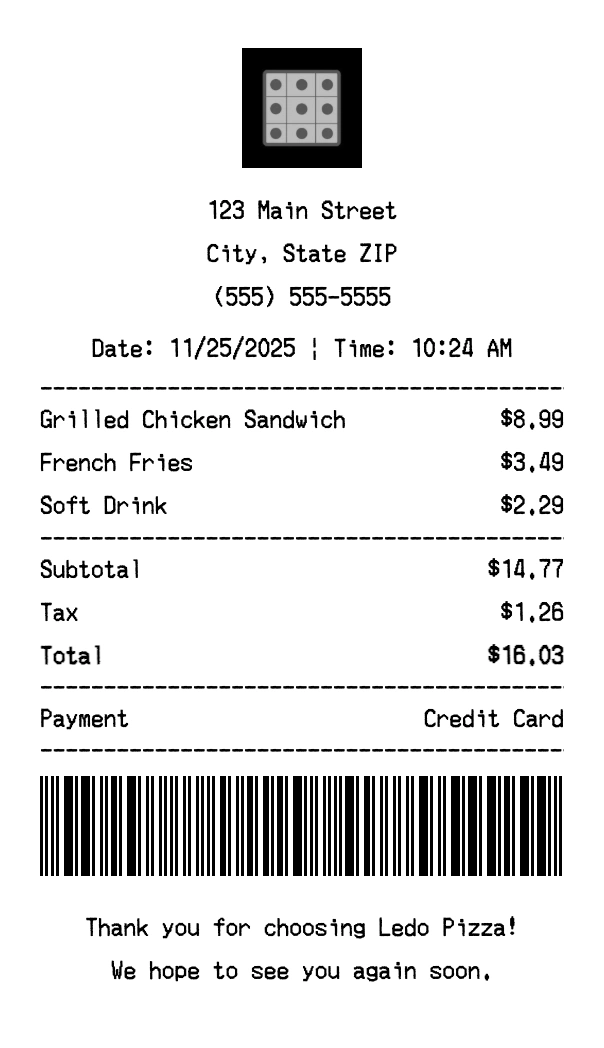 Create authentic Ledo Pizza receipts instantly. Our free receipt generator produces professional fast food receipts with company logo, itemized purchases, tax calculations, and payment details. Perfect for expense tracking, reimbursement, and documentation. Download high-quality PNG receipts in seconds.