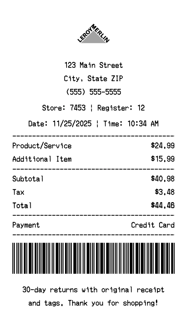 Create authentic Leroy Merlin receipts instantly. Our free receipt generator produces professional home improvement receipts with company logo, itemized purchases, tax calculations, and payment details. Perfect for expense tracking, reimbursement, and documentation. Download high-quality PNG receipts in seconds.