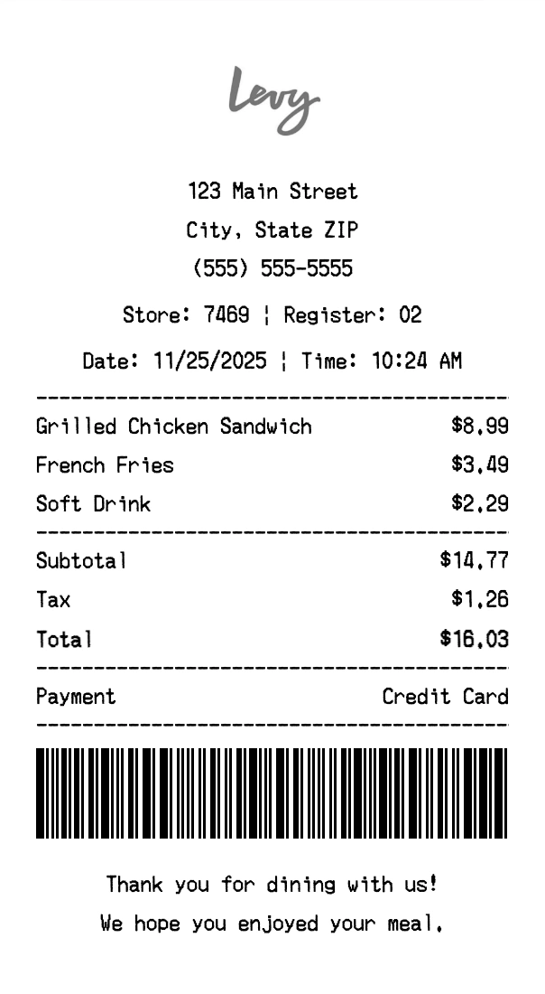 Create authentic Levy Restaurants receipts for restaurant group purchases. Our free receipt generator tool helps you create professional, detailed receipts instantly. Perfect for business expense tracking, reimbursement requests, and personal documentation. Download high-quality PNG receipts in seconds, no signup required.