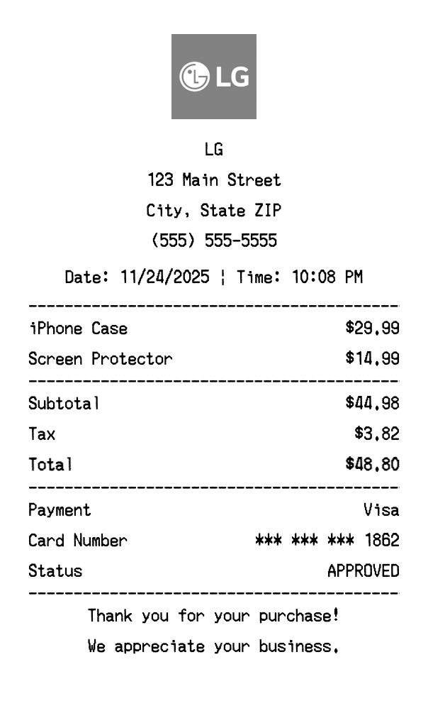 Create authentic LG receipts for technology purchases. Our free receipt generator tool helps you create professional, detailed receipts instantly. Perfect for business expense tracking, reimbursement requests, and personal documentation. Download high-quality PNG receipts in seconds, no signup required.