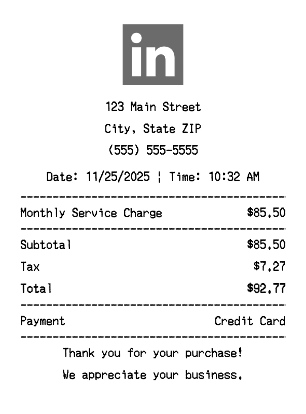 Create authentic LinkedIn Learning receipts instantly. Our free receipt generator produces professional education receipts with company logo, itemized purchases, tax calculations, and payment details. Perfect for expense tracking, reimbursement, and documentation. Download high-quality PNG receipts in seconds.