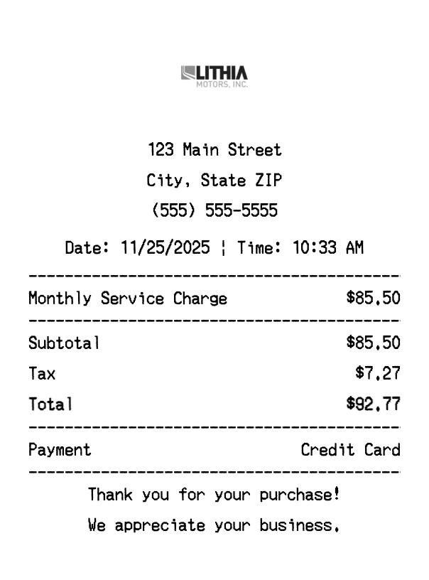 Create authentic Lithia Motors receipts instantly. Our free receipt generator produces professional car dealer receipts with company logo, itemized purchases, tax calculations, and payment details. Perfect for expense tracking, reimbursement, and documentation. Download high-quality PNG receipts in seconds.