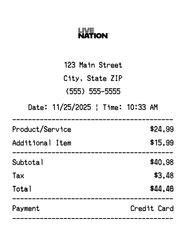 Create authentic Live Nation receipts instantly. Our free receipt generator produces professional entertainment receipts with company logo, itemized purchases, tax calculations, and payment details. Perfect for expense tracking, reimbursement, and documentation. Download high-quality PNG receipts in seconds.
