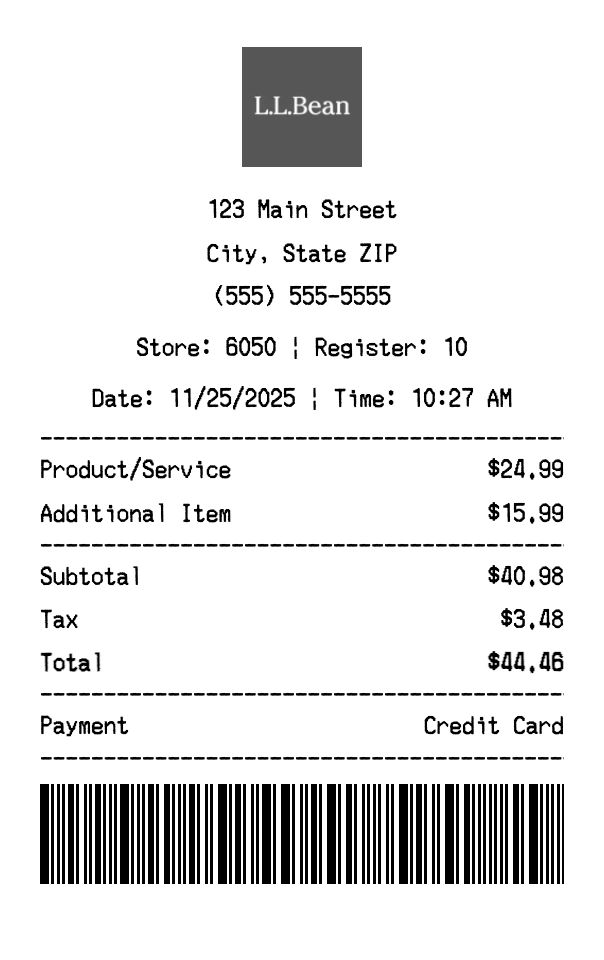 Create authentic L.L.Bean receipts instantly. Our free receipt generator produces professional outdoor retail receipts with company logo, itemized purchases, tax calculations, and payment details. Perfect for expense tracking, reimbursement, and documentation. Download high-quality PNG receipts in seconds.