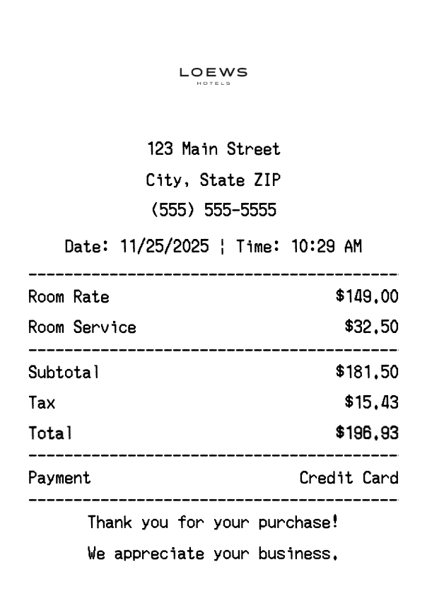 Create authentic Loews Hotels receipts instantly. Our free receipt generator produces professional hotels receipts with company logo, itemized purchases, tax calculations, and payment details. Perfect for expense tracking, reimbursement, and documentation. Download high-quality PNG receipts in seconds.