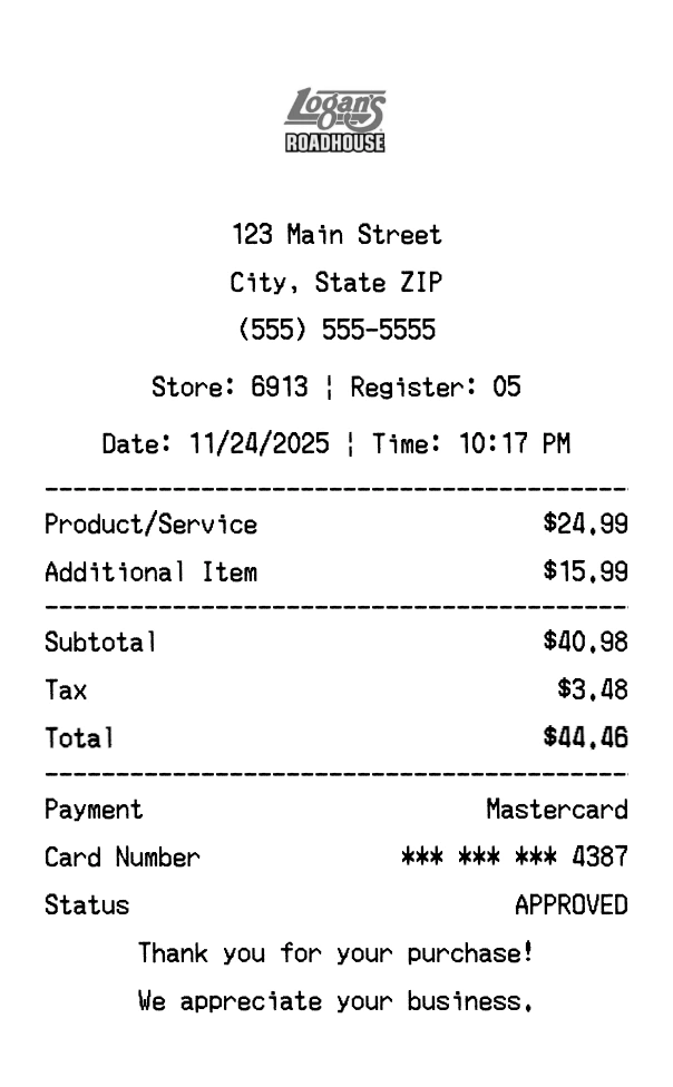 Create authentic Logan's Roadhouse receipts for casual dining purchases. Our free receipt generator tool helps you create professional, detailed receipts instantly. Perfect for business expense tracking, reimbursement requests, and personal documentation. Download high-quality PNG receipts in seconds, no signup required.