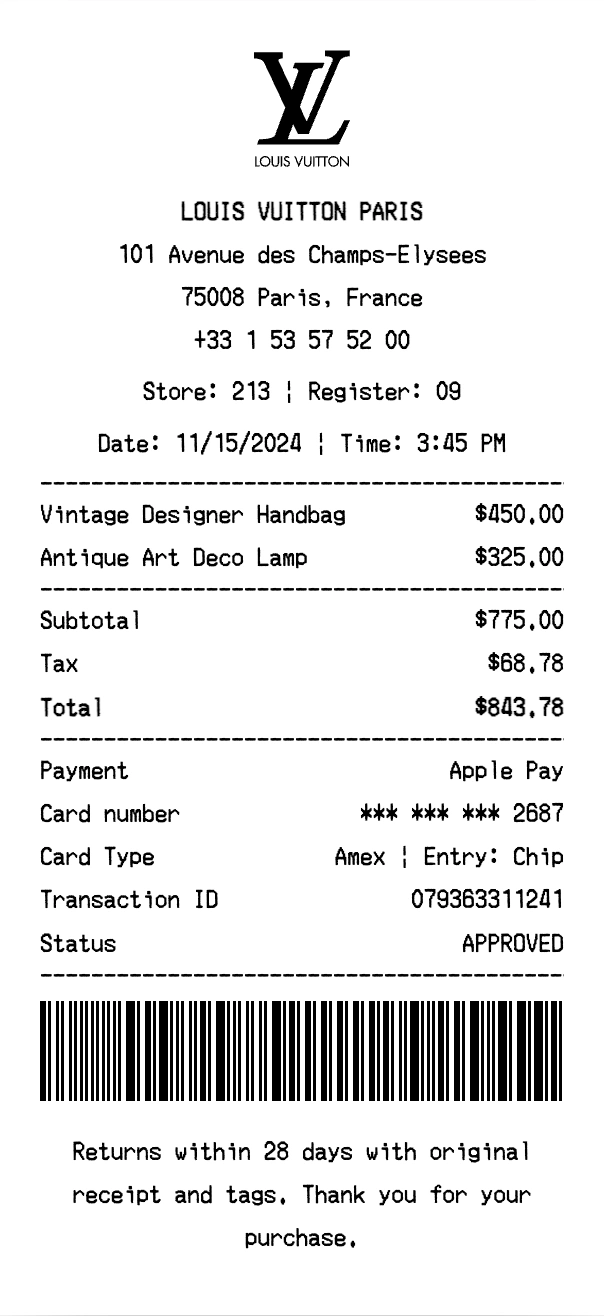Create authentic Louis Vuitton receipts for fashion & luxury purchases. Our free receipt generator tool helps you create professional, detailed receipts instantly. Perfect for business expense tracking, reimbursement requests, and personal documentation. Download high-quality PNG receipts in seconds, no signup required.