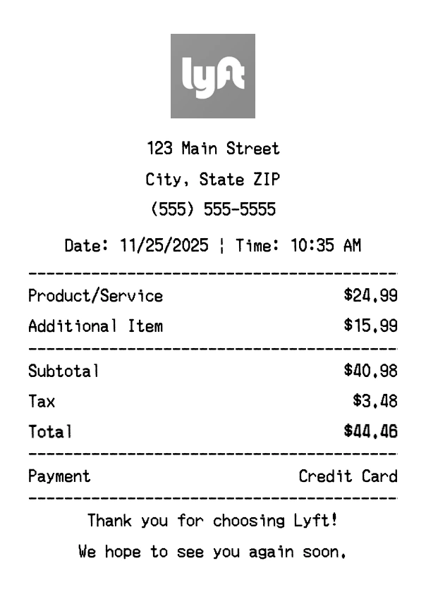 Our Lyft receipt generator creates professional receipts that match the authentic Lyft format. Each receipt includes the company logo, business information, transaction details, itemized purchase list, tax calculations, and payment information. All receipts are formatted to look exactly like real Lyft receipts, making them perfect for expense reports, tax documentation, and reimbursement purposes.