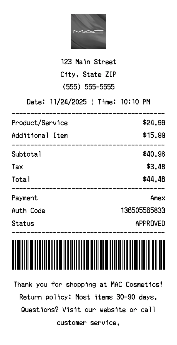 Create authentic MAC Cosmetics receipts for beauty purchases. Our free receipt generator tool helps you create professional, detailed receipts instantly. Perfect for business expense tracking, reimbursement requests, and personal documentation. Download high-quality PNG receipts in seconds, no signup required.