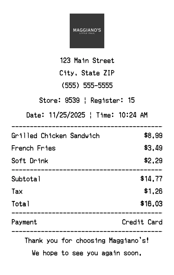 Create authentic Maggiano's receipts instantly. Our free receipt generator produces professional casual dining receipts with company logo, itemized purchases, tax calculations, and payment details. Perfect for expense tracking, reimbursement, and documentation. Download high-quality PNG receipts in seconds.