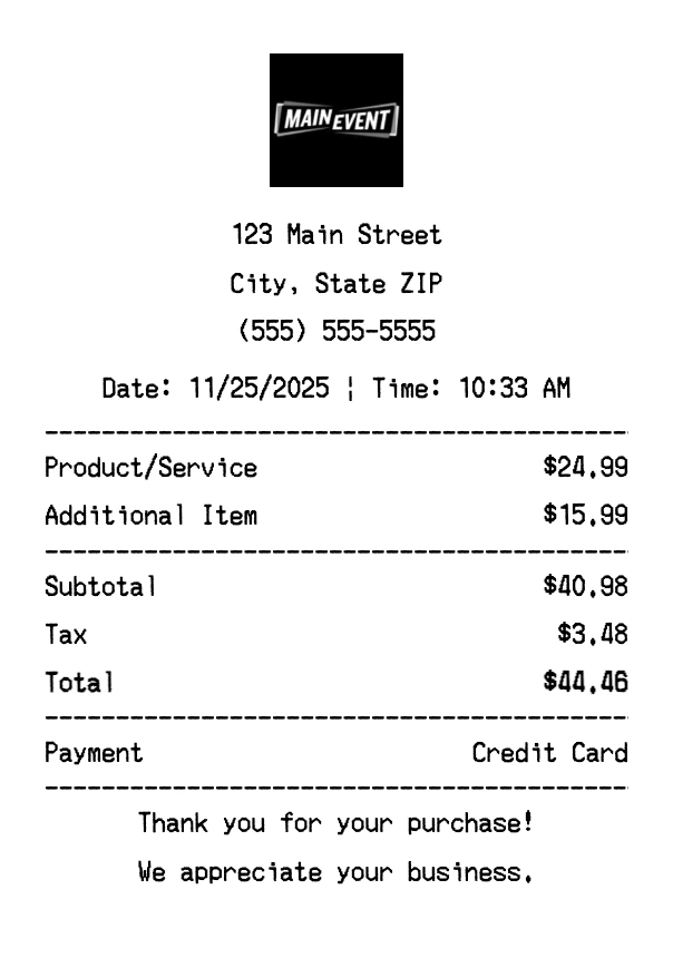 Create authentic Main Event receipts for entertainment purchases. Our free receipt generator tool helps you create professional, detailed receipts instantly. Perfect for business expense tracking, reimbursement requests, and personal documentation. Download high-quality PNG receipts in seconds, no signup required.