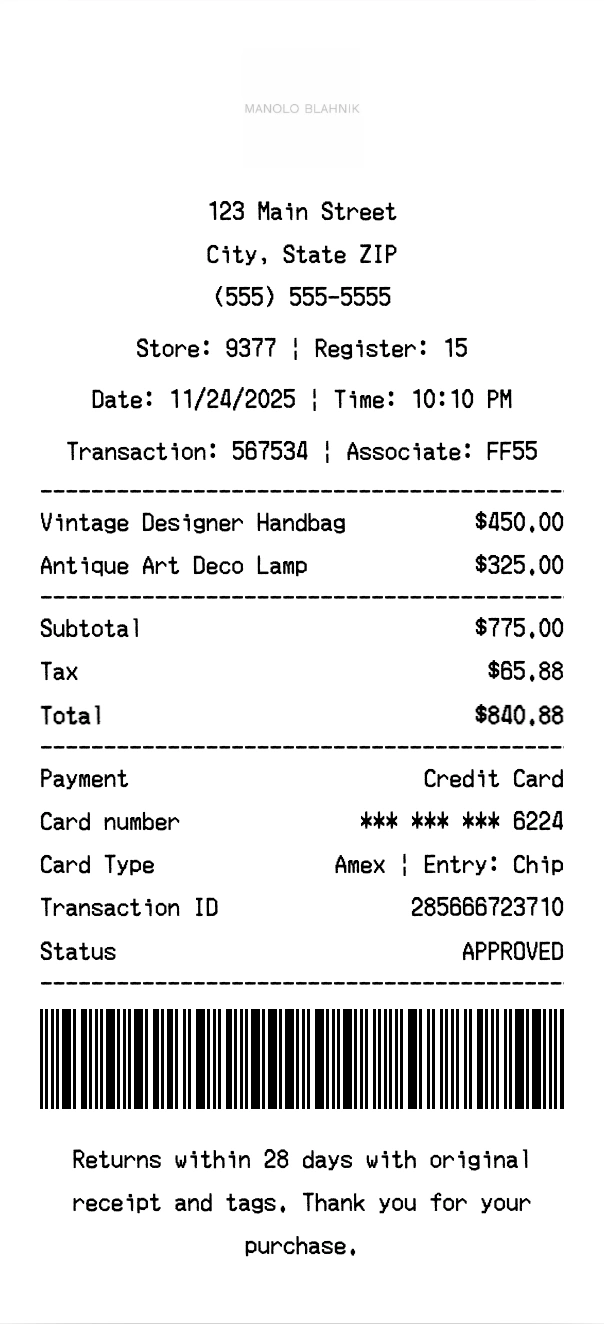 Create authentic Manolo Blahnik receipts for luxury fashion purchases. Our free receipt generator tool helps you create professional, detailed receipts instantly. Perfect for business expense tracking, reimbursement requests, and personal documentation. Download high-quality PNG receipts in seconds, no signup required.