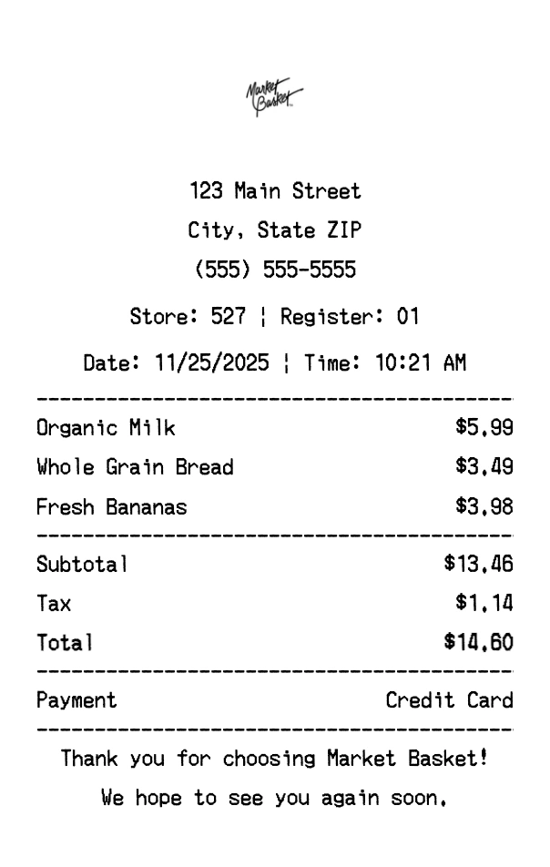 Use our free Market Basket Receipt Maker to create professional receipts in seconds.