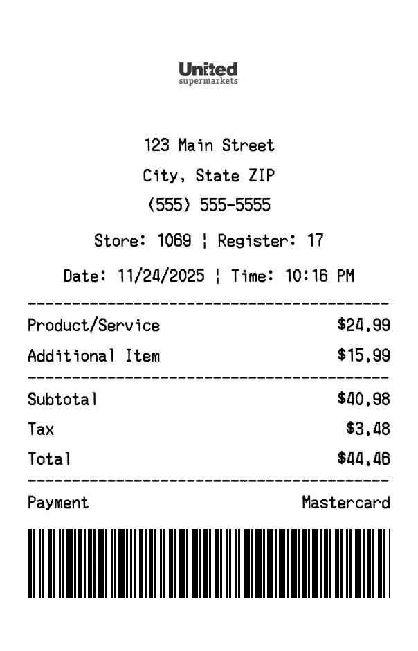 Create authentic Market Street receipts instantly. Our free receipt generator produces professional grocery store receipts with company logo, itemized purchases, tax calculations, and payment details. Perfect for expense tracking, reimbursement, and documentation. Download high-quality PNG receipts in seconds.