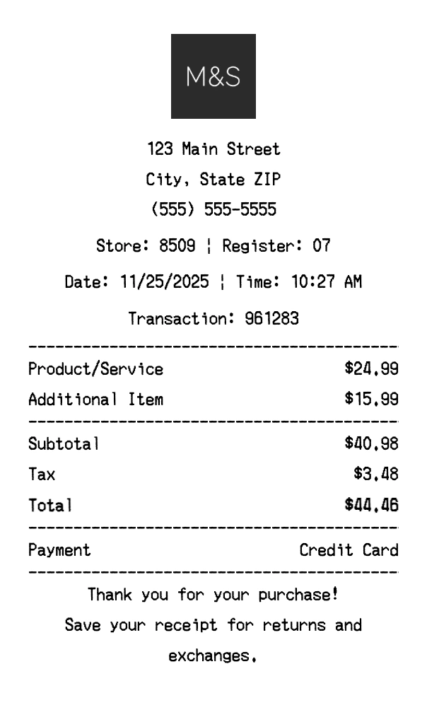 Create authentic Marks & Spencer receipts for department store purchases. Our free receipt generator tool helps you create professional, detailed receipts instantly. Perfect for business expense tracking, reimbursement requests, and personal documentation. Download high-quality PNG receipts in seconds, no signup required.