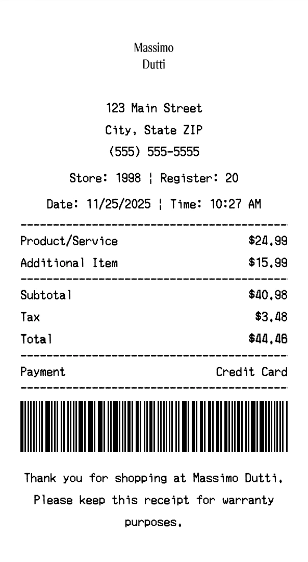 Create authentic Massimo Dutti receipts for fashion purchases. Our free receipt generator tool helps you create professional, detailed receipts instantly. Perfect for business expense tracking, reimbursement requests, and personal documentation. Download high-quality PNG receipts in seconds, no signup required.