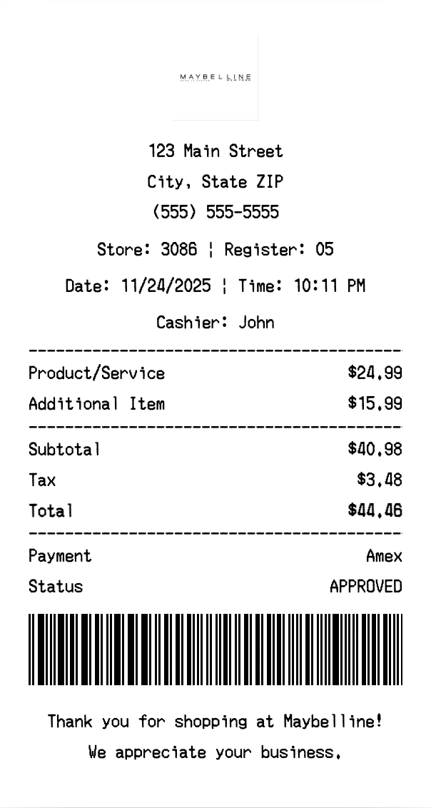 Create authentic Maybelline receipts for beauty purchases. Our free receipt generator tool helps you create professional, detailed receipts instantly. Perfect for business expense tracking, reimbursement requests, and personal documentation. Download high-quality PNG receipts in seconds, no signup required.